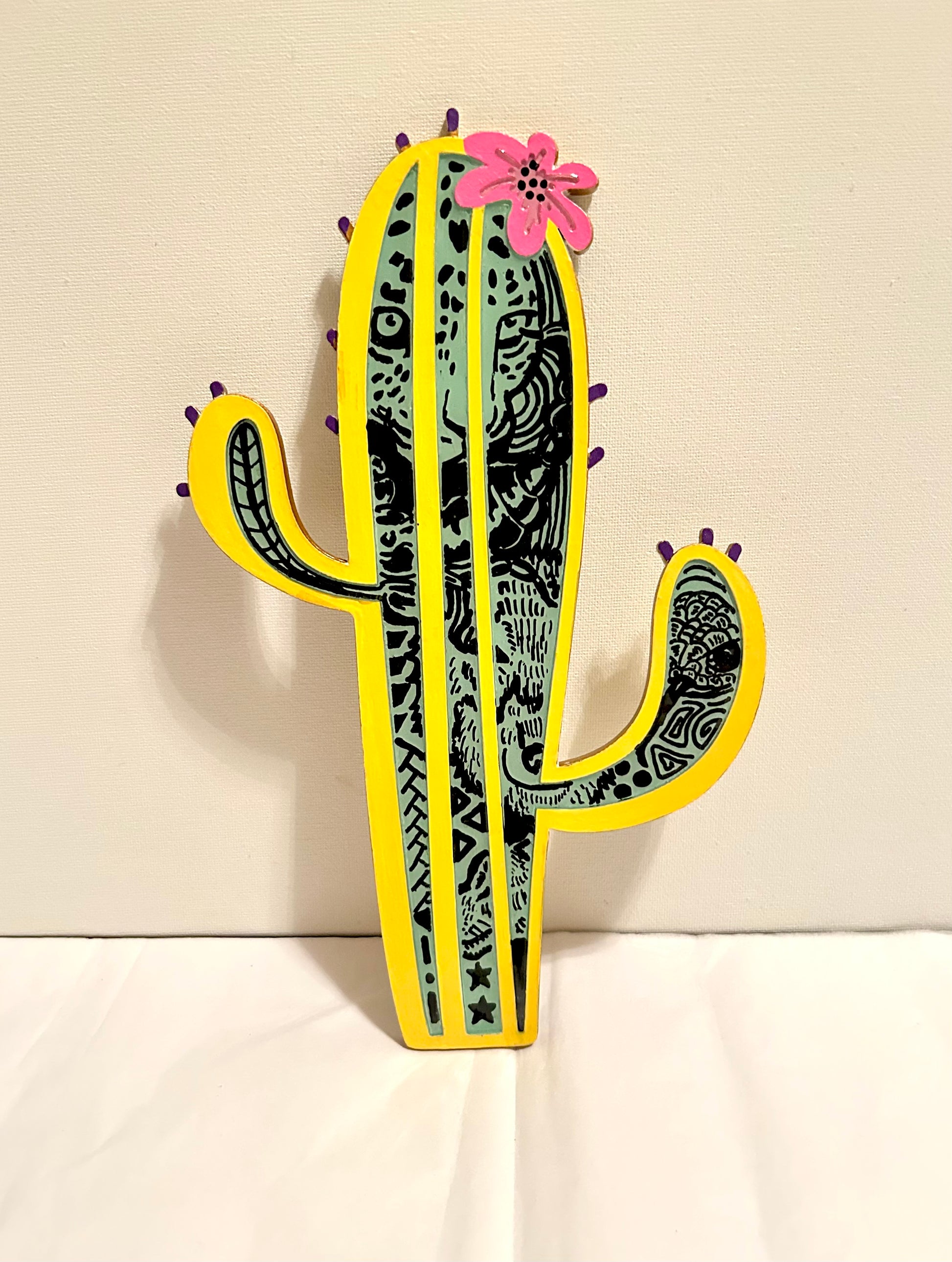 Add a burst of playful charm to any room with the Saguaro Cactus Wood Cut. This hand-painted piece combines wood and resin to showcase a quirky jungle cat adorned in intricate zentangle patterns. Its fun and unique design makes it a perfect gift or a standout decoration that sparks joy and conversation.
